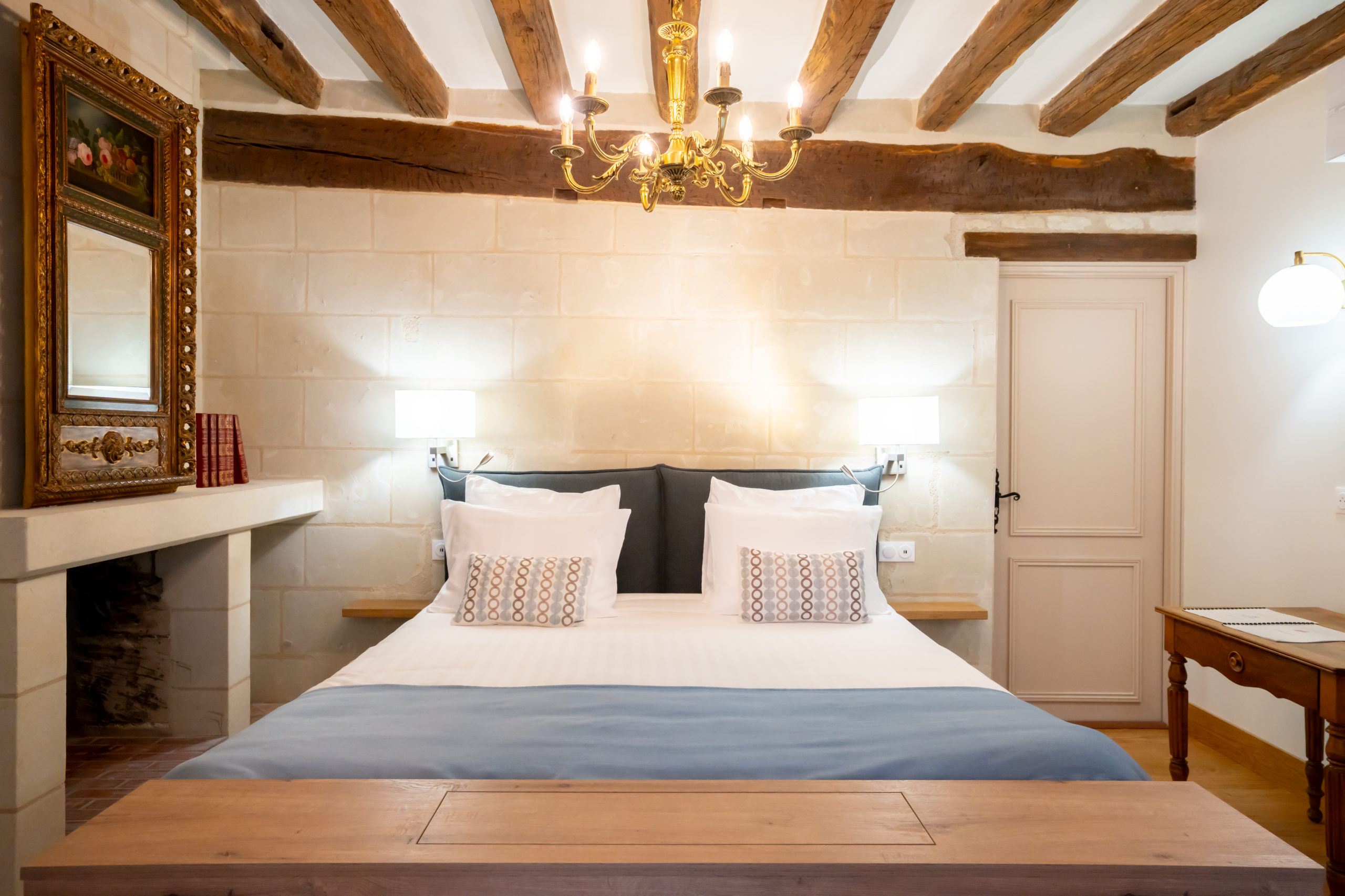 Chambre de charme climatisée avec un salon privé et vue sur le jardin.